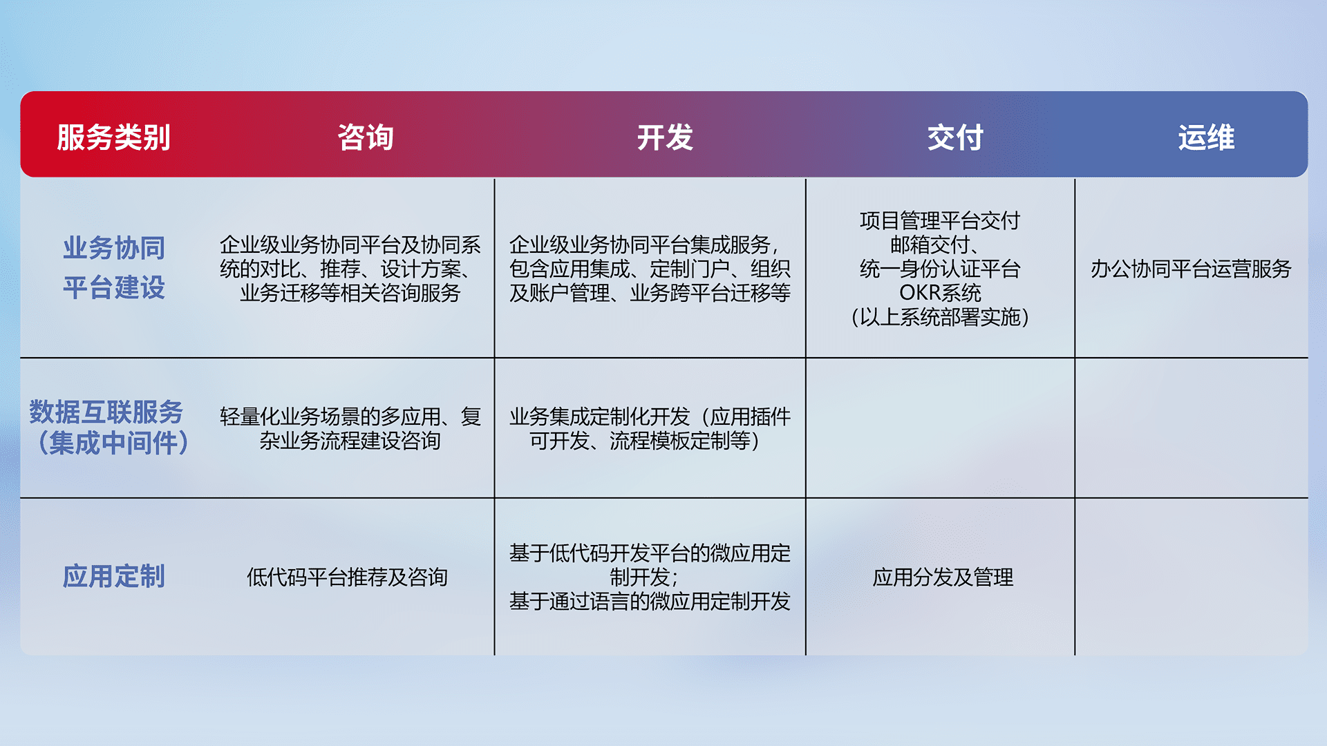 针对钉钉、、、企微、、、、IDaas等平台级产品提供产品的规划、、、、方案、、、、交付、、、定制化开发等服务,,,,实现如统一协同办公、、智能客户服务、、混合会议管理、、、智能数据查询、、等业务场景,,,实现数字化转型。。。。