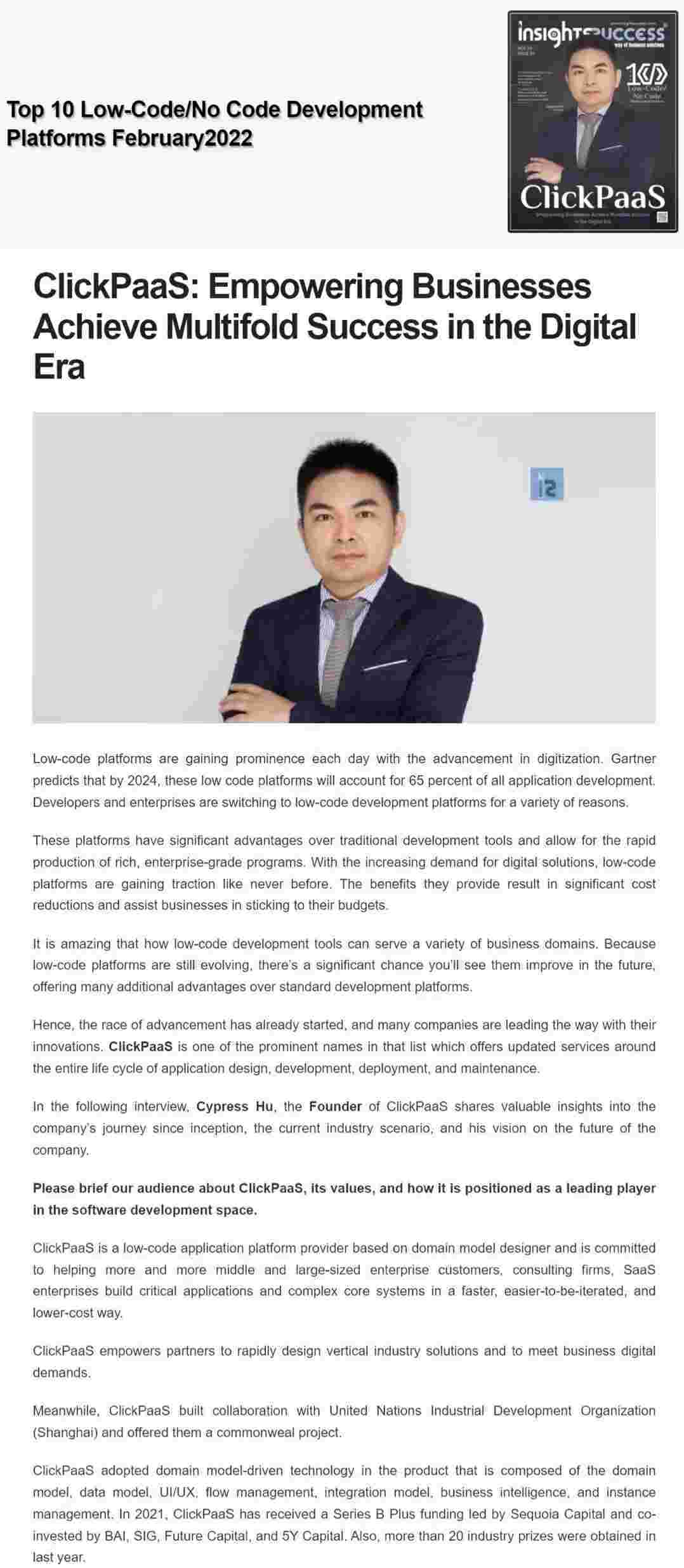 2022年年初,,,,,,,,,,抖音钱包入选外媒Insights Success低代码/无代码开发平台 Top10,,,,创始人、、、、、、、、、、、、CEO胡柏受邀接受专访并荣登封面人物,,,,,,他与Insights Success的读者分享了抖音钱包成立的初心、、、、、、、发展历程、、、、、、、、、、、当前的行业发展趋势以及他对公司未来的展望。。。。。。。